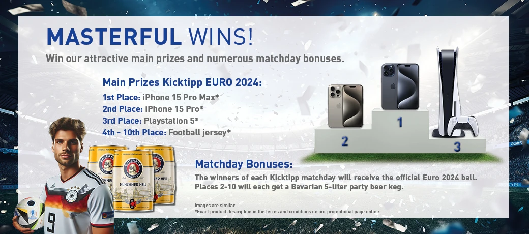 Join our prediction round, choose a tipper name/nickname, and make predictions for each EURO 2024 match. You can also play Kicktipp via the Kicktipp app on your smartphone or tablet after joining our game (available for download on Google Play and the Apple App Store).